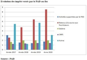 En observant le tableau, on note une baisse des sommes versées par le PAD, les montants versés à la Direction Générale des Impôts (DGI) au titre de l’impôt sur les activités supportées. Ils passent d’environ 3,097 milliards de FCFA en 2017 à 1,753 milliard en 2020. Il en est de même pour les impôts liés aux soldes des impôts des DSF, aux régularisations CNPS, et aux redressements VGC. Ceux-ci passent de près de 5,469 milliards de FCFA en 2017 à 3,123 milliards de FCFA en 2020.