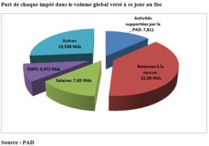 Cet argent concerne à la fois l’impôt sur les activités supportées par le PAD (environ 7,811 milliards de FCFA), les impôts retenus à la source aux fournisseurs (22,380 milliards de FCFA) ; l’impôt sur les salaires (7,650 milliards de FCFA), la CNPS (5,472 milliards de FCFA), et les autres impôts, notamment les impôts liés aux soldes des impôts des DSF, pour ne citer que ceux-là, pour environ 15,538 milliards de FCFA.