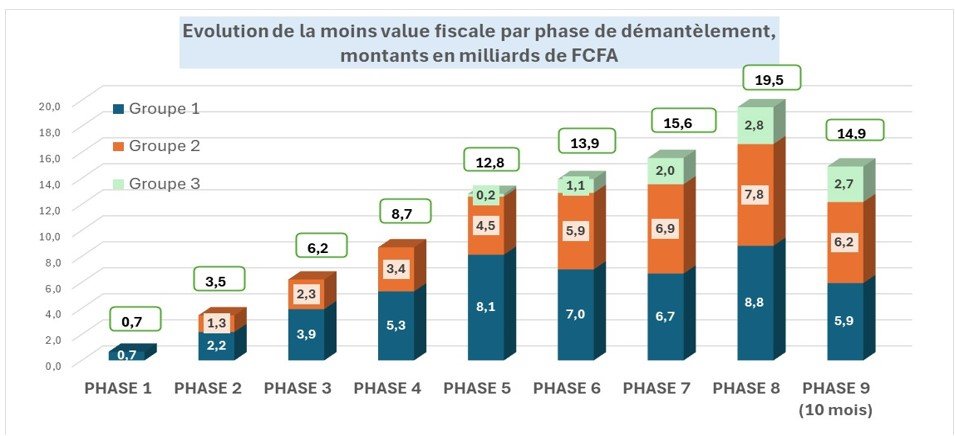 Le montant cumulé de la moins-value fiscale générée depuis le lancement du processus de démantèlement tarifaire est estimé à 95,7 milliards de FCFA. Sur ce total, 80,8 milliards de FCFA correspondent aux pertes enregistrées au cours des huit premières phases de mise en œuvre. Les dix premiers mois de la neuvième phase ont, quant à eux, occasionné une moins-value supplémentaire de 14,9 milliards de FCFA.
