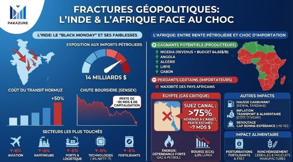 Le blocage du détroit d’Ormuz, principal corridor mondial pour le transport du pétrole, ne se limite pas à une crise régionale. L’infographie réalisée par Pakazure met en lumière les fractures géopolitiques et économiques que ce type de perturbation provoque, en particulier pour l’Inde et l’Afrique.
