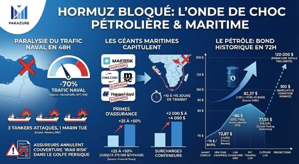 Le prix du baril a brutalement grimpé, allant de 70 dollars avant le conflit à plus de 82 dollars lors du pic de trading, soit une hausse de 17,6 %. Les projections évoquent un baril à 100 dollars en cas de fermeture prolongée, voire 120 à 200 dollars si le blocage persiste.